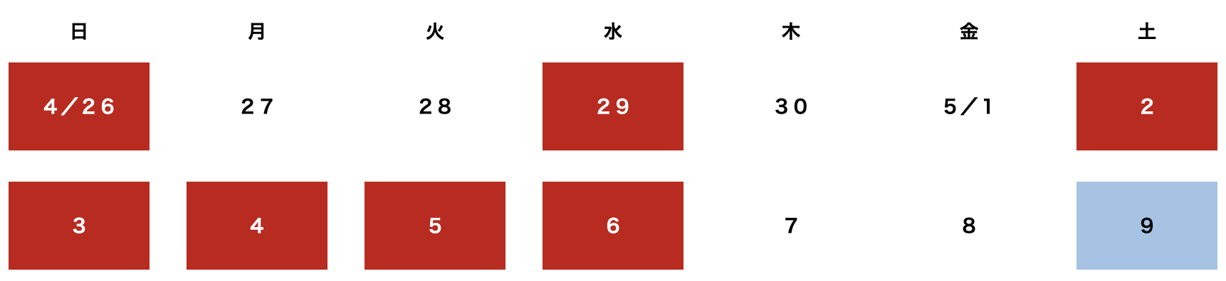 休業期間:4月29日、5月2日~5月6日